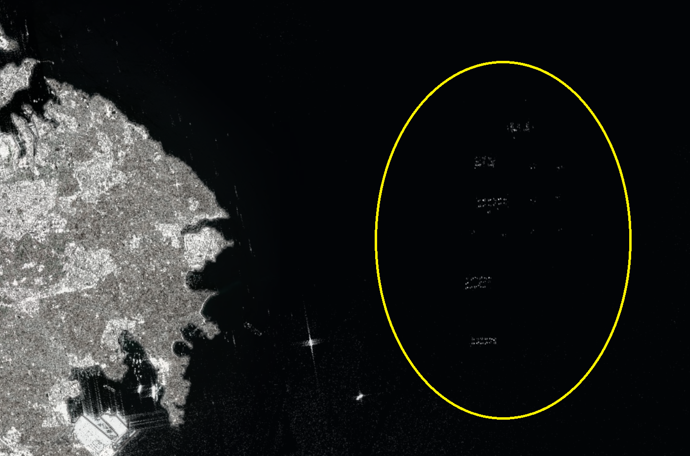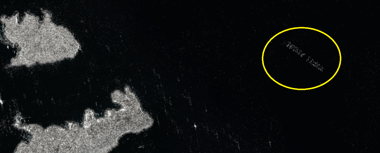 Tuna pen cages are ridiculously easy to pick out on SAR imagery, especially in Sentinel-1 VV mode. While the open water scatters the energy, the cage structures are metal with sharp angles, reflecting the radar signal. This produces bright spots against the darker background of the sea, making them roughly akin to the radio equivalent of finding a bright light in a pitch black night.