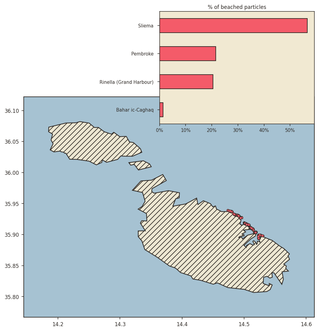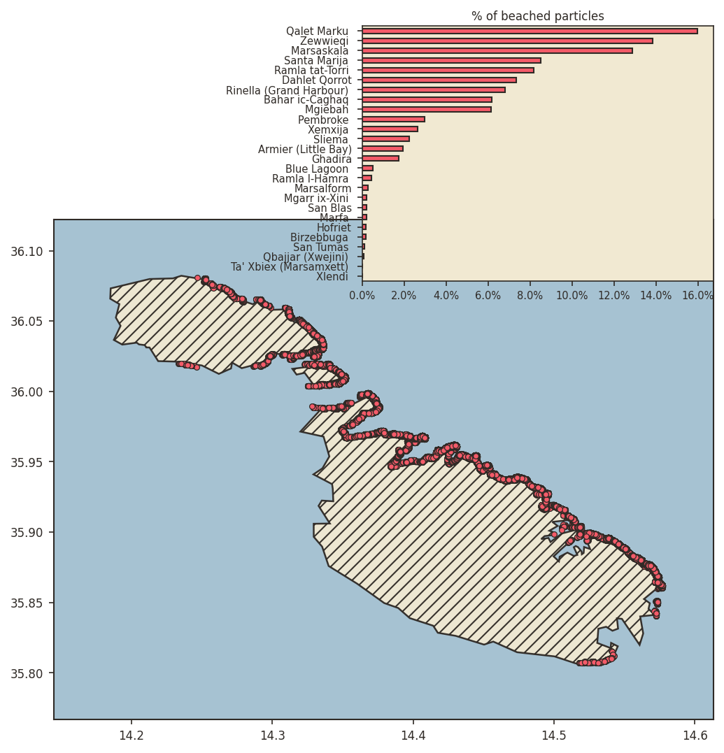 For the purposes of the experimental forecast, we seed particles twice a day, and run 24 hour simulations on those. A particle is considered “beached” if it touches any part of the shore.