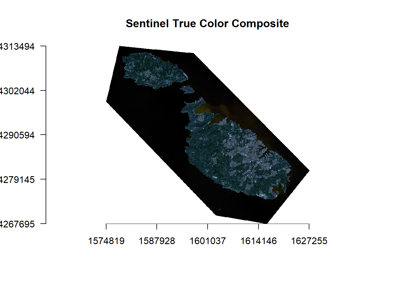 plotRGB(MaltaRGB, axes = T, stretch = "lin", main = "Sentinel True Color Composite")