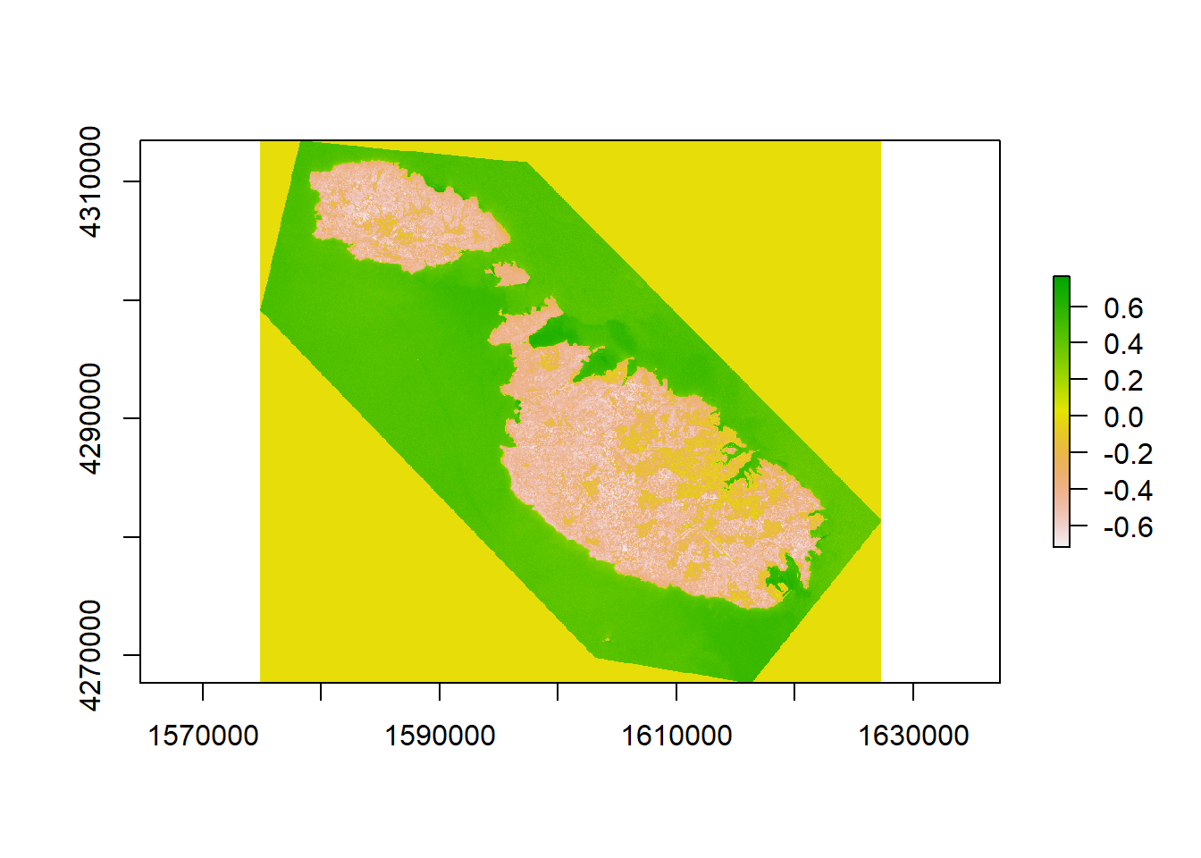 I’ll use two such indexes below, the normalized difference vegetation index to assess vegetation, and the normalized difference water index, to create a homogenous layer for the sea.